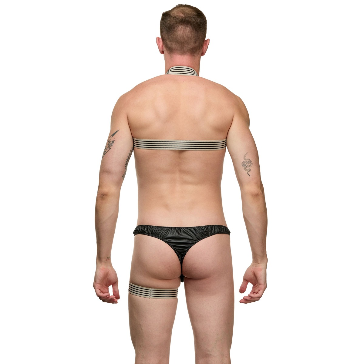 Мужской костюм «Танцор». Выполнен в черно-бежевом цвете и состоит из 3 предметов. В комплекте: трусы-тонги, подвязка на ногу, портупея.