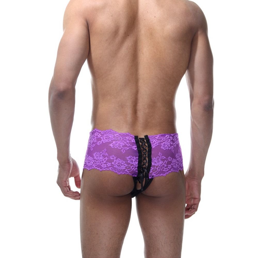 Мужские танга с высокой посадкой, на широком поясе из фиолетового кружева. Сзади черная шнуровка на всю высоту трусов. Низ трусов из черной тянущейся гладкой ткани.