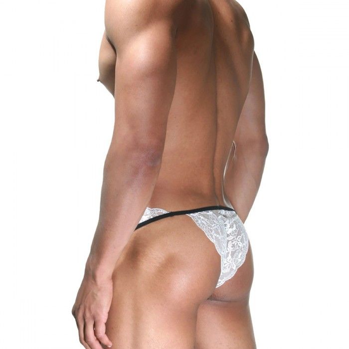 Мужские трусы-танга из белого кружева, с блестящей, черной, гладкой вставкой спереди.