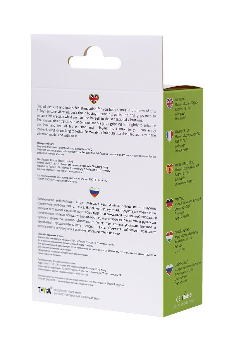 Силиконовое виброкольцо А-Toys позволит вам усилить ощущения и получить совместное удовольствие от секса. Надев кольцо, мужчина почувствует увеличение эрекции, в то время как ваша партнерша будет наслаждаться чувственной вибрацией. Силиконовое кольцо обладает эластичностью, что позволяет растянуть игрушку до нужного диаметра, плотно обхватывает пенис, тем самым усиливая эрекцию и увеличивая продолжительность полового акта. Съемная вибропуля позволяет использовать игрушку как в режиме вибрации, так и без нее.