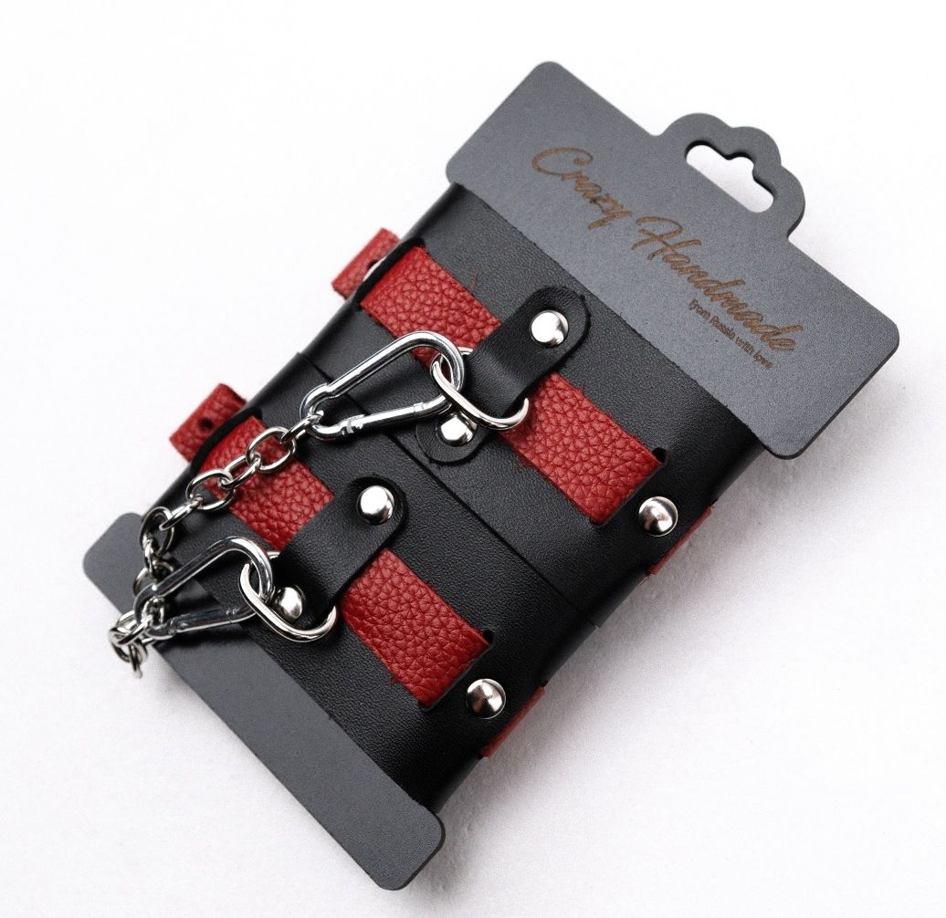 Кожаные наручники на сцепке. Металлическая сцепка на карабинах.