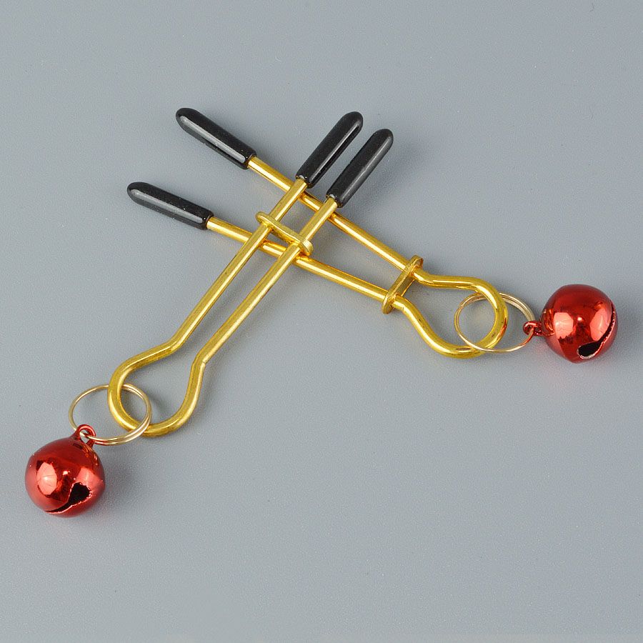 Золотистые зажимы с колокольчиками Gold. Зажимы имеют регулятор и полимерные наконечники на концах. Подвески в виде круглых колокольчиков. Привнесут в вашу БДСМ-игру капельку озорства.