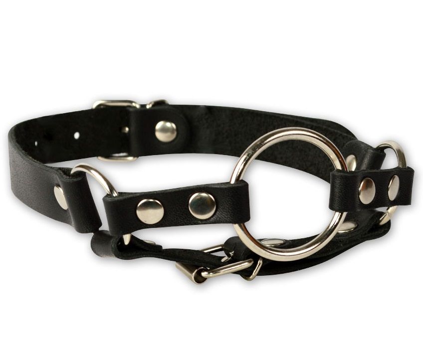 Кляп-кольцо на чёрных кожаных ремешках с застёжкой.