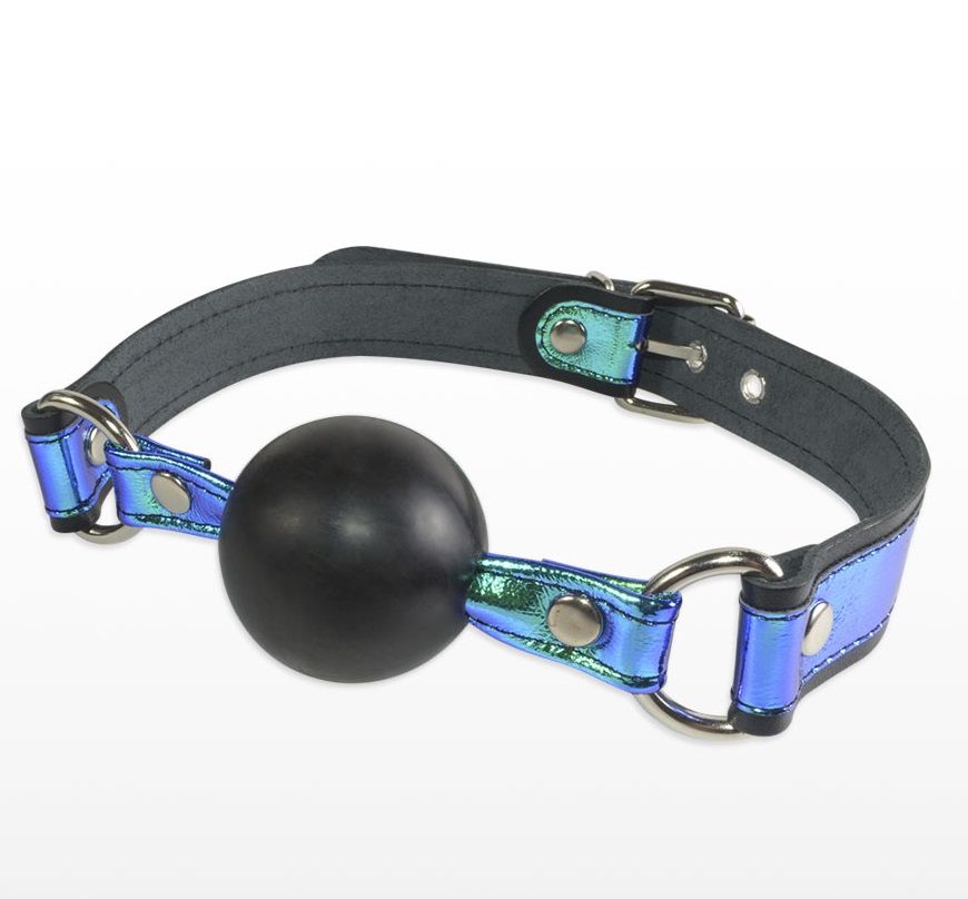Эффектный девайс в виде сферического кляпа с яркими ремешками из натуральной высококачественной кожи чёрного цвета, сделает ролевые игры особенно страстными и запоминающимися. Ремешки кляпа декорированы голографическими вставками синего цвета, который отливает изумрудным, салатным и бирюзовыми оттенками. Кляп-шар не способен повредить зубы и прост в гигиеническом уходе, достаточно промыть теплой водой с мыльным раствором. Легко зафиксировать девайс на шее и отрегулировать размер можно при помощи пряжки. Вся используемая фурнитура имеет хромированное покрытие. Ширина ремешков - 2,5 см. Диаметр шара - 4,5 см.