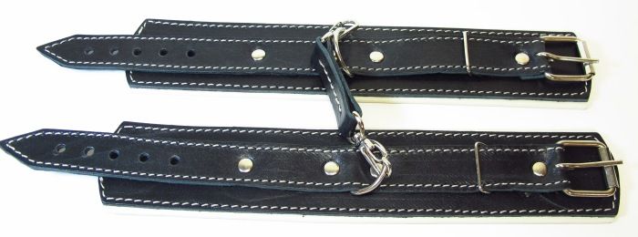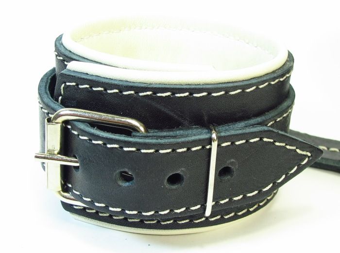 Оковы на ноги с бежевым подкладом. Выполнены из толстой ременной кожи черного цвета, подклад мягкая перчаточная кожа светло бежевого цвета. На пряжке. Использована усиленная металлическая фурнитура. Строчка толстой ниткой контрастного светлого цвета.