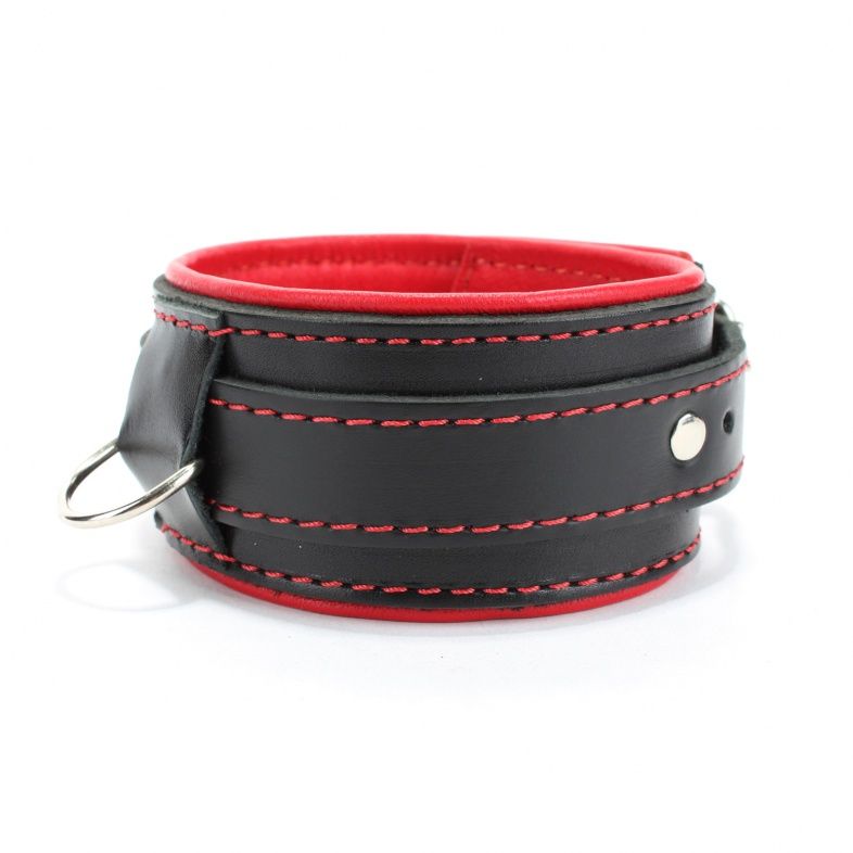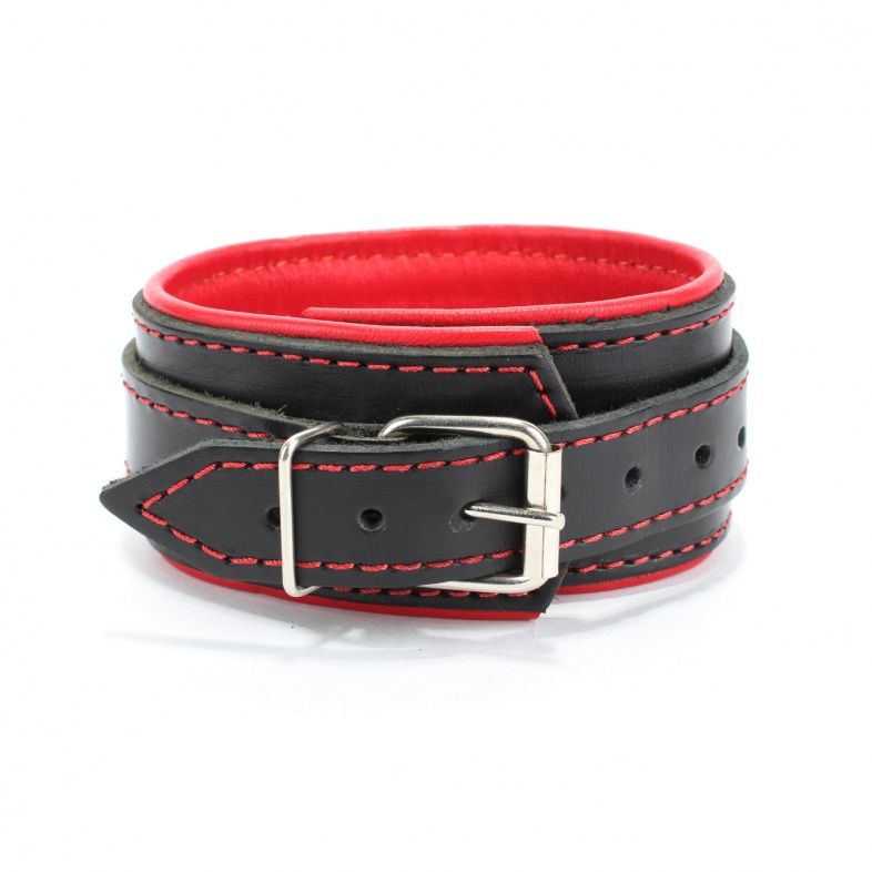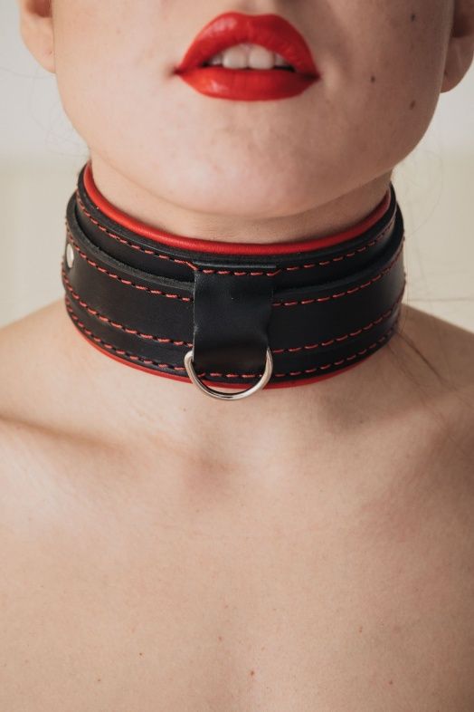 Ошейник с красным подкладом. Выполнен из толстой ременной кожи черного цвета, подклад мягкая перчаточная кожа ярко красного цвета. На пряжке. Использована усиленная металлическая фурнитура. Строчка толстой ниткой контрастного красного цвета.