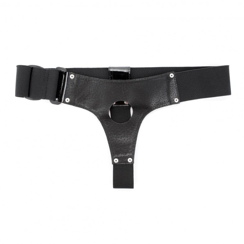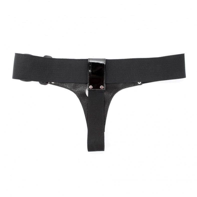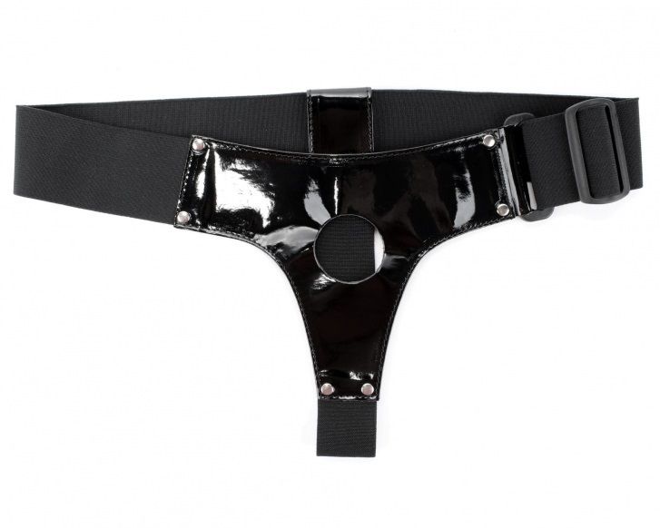 Трусики для страпона черного цвета, изготовлены блестящего лакового материала. Крепятся при помощи широких эластичных резинок (размер легко меняется) Диаметр отверстия для страпона - 4 см.