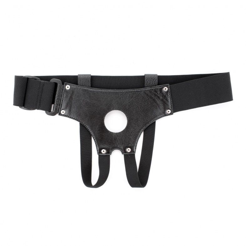 Трусики для страпона, изготовлены из кожи, имеют отверстие-доступ в области бикини. Крепятся при помощи широких эластичных лент. Размер легко меняется при помощи застежки. Диаметр отверстия для страпона - 4 см.