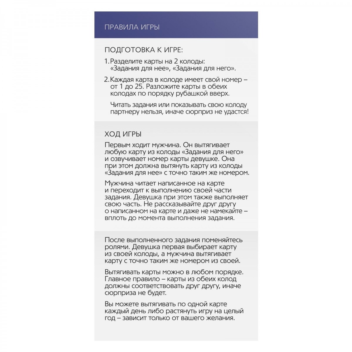 Испытайте новые эмоцииХотите сделать каждый день с любимым человеком незабываемым? Тогда пришло время перейти к романтическим действиям, которые разнообразят отношения и разделят их на: до и после. Секрет, как этого добиться, прост: вытягивайте карточки, готовьте для второй половинки приятные сюрпризы и наслаждайтесь совместным временем!Состав:• 50 карт,• правила игрыПусть романтика между вами никогда не исчезает!